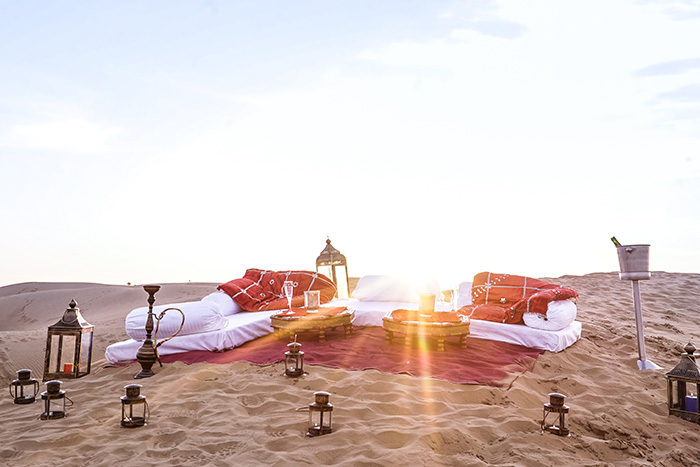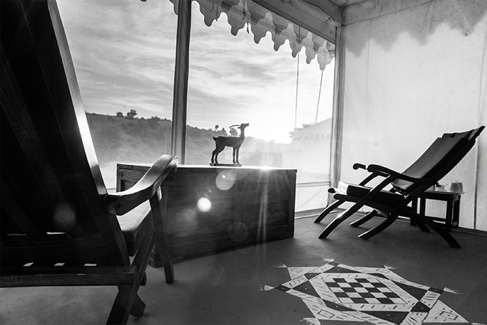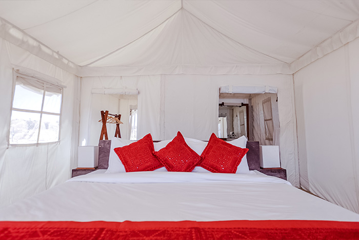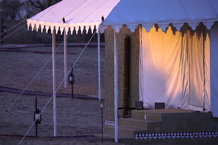 Situated at the heart of Rajasthan, surrounded by sand dunes and wildlife - Dhora is the destination for those who don't want to just visit Rajasthan but want to experience it at its purest. Located 100 km from Jodhpur, the resort is spread over 45 acres of desert at its rawest. Dhora is an oasis of luxury amidst endless sand dunes, which are also home to native wildlife like Indian Gazelles, Desert Foxes, Blue Bulls, Wild Boars and Hares. The resort has 15 tented suites facing a pond surrounded by sand dunes. Each tent comes with an en-suite bathroom, an open shower and a verandah. All tented suites have air conditioners and heaters to ensure your stay is comfortable, irrespective of the weather conditions. Beds carved out of unique locally sourced sandstone add to the rustic but luxurious vibe of the resort. Dhora features 2 spa tents and a plunge pool to help you relax and a dining area for you to relish the best of Rajasthani and continental cuisines.